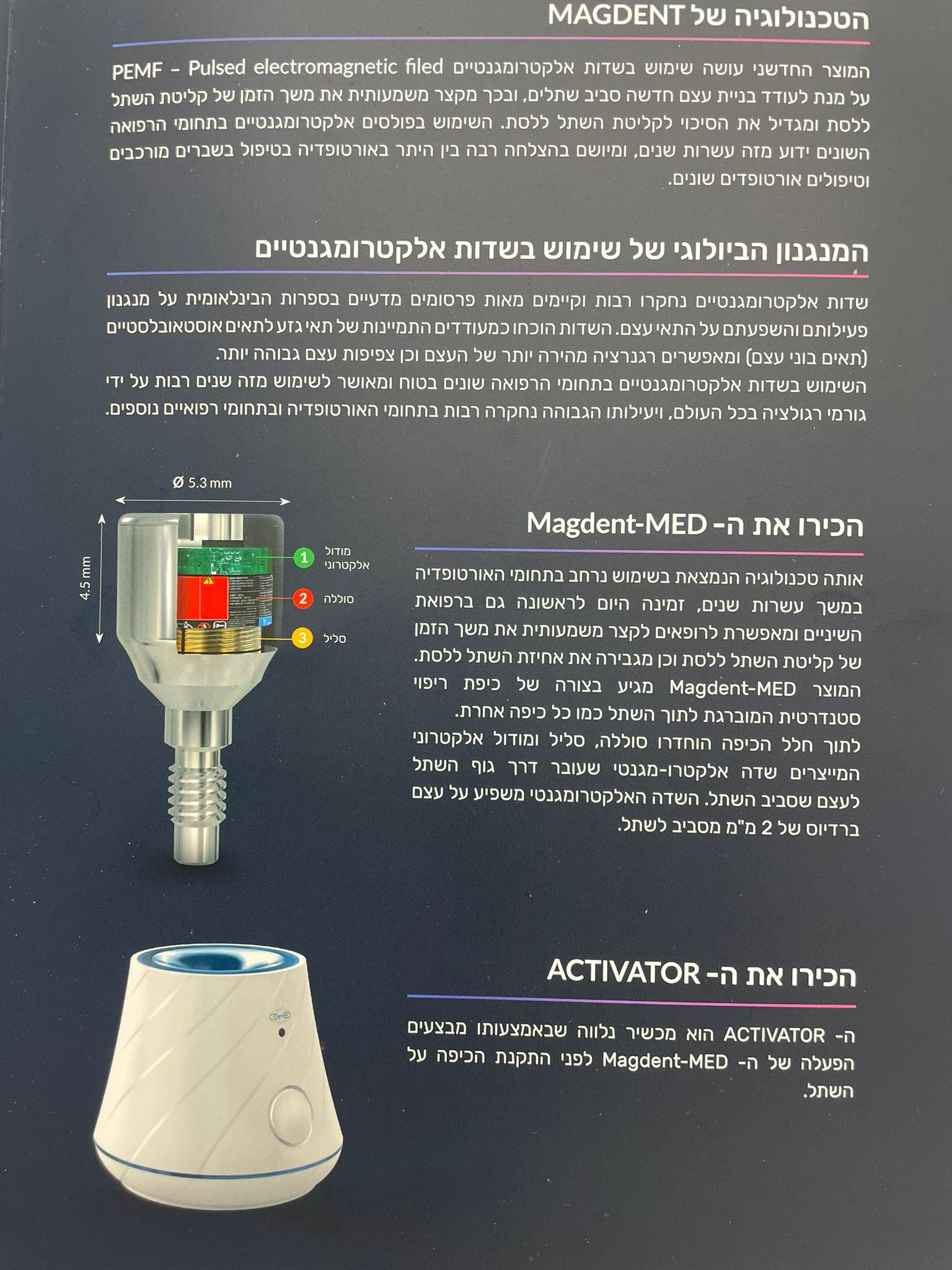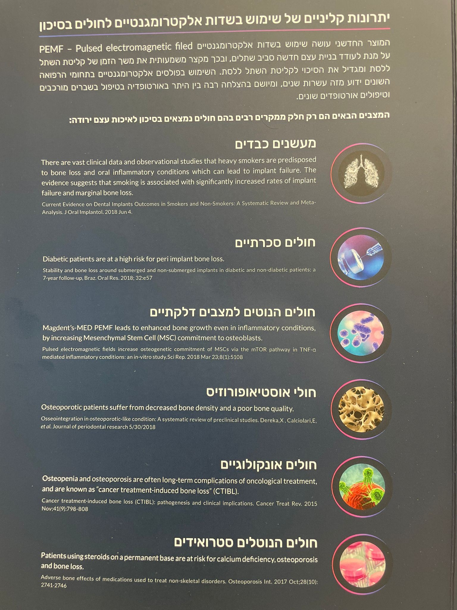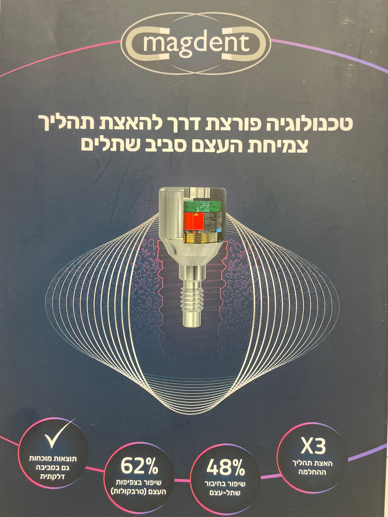 טכנולוגיית MAGDENT מציעה פתרון חדשני ומבטיח להשתלת שיניים לחולי אוסטיאופורוזיס. המערכת משתמשת בשדות אלקטרומגנטיים פולסטיליים (PEMF) כדי לגרות ולהאיץ את תהליך בניית העצם סביב השתל. לחולי אוסטיאופורוזיס, שסובלים מאיכות עצם ירודה, טכנולוגיה זו יכולה להיות מכרעת בשיפור סיכויי ההצלחה של ההשתלה. MAGDENT פועלת על ידי עידוד התמיינות של תאי גזע לתאים בוני עצם, הגברת צפיפות העצם, ושיפור החיבור בין השתל לעצם. מחקרים הראו כי השימוש בטכנולוגיה זו יכול להאיץ את תהליך האוסאואינטגרציה ולשפר את איכות העצם סביב השתל. לחולי אוסטיאופורוזיס, זה יכול להתבטא בשיפור משמעותי ביציבות השתל ובהפחתת הסיכון לכישלון ההשתלה.
